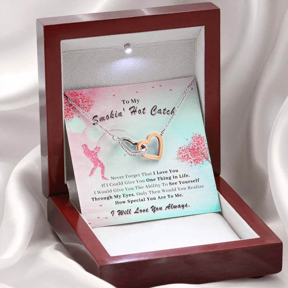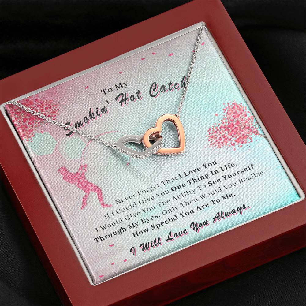 Two hearts embellished with Cubic Zirconia stones, interlocked together as a symbol of never-ending love. Made with high quality polished surgical steel. Cable chain measures 18 inches with a 4 inch extension, and fastens with a lobster clasp.