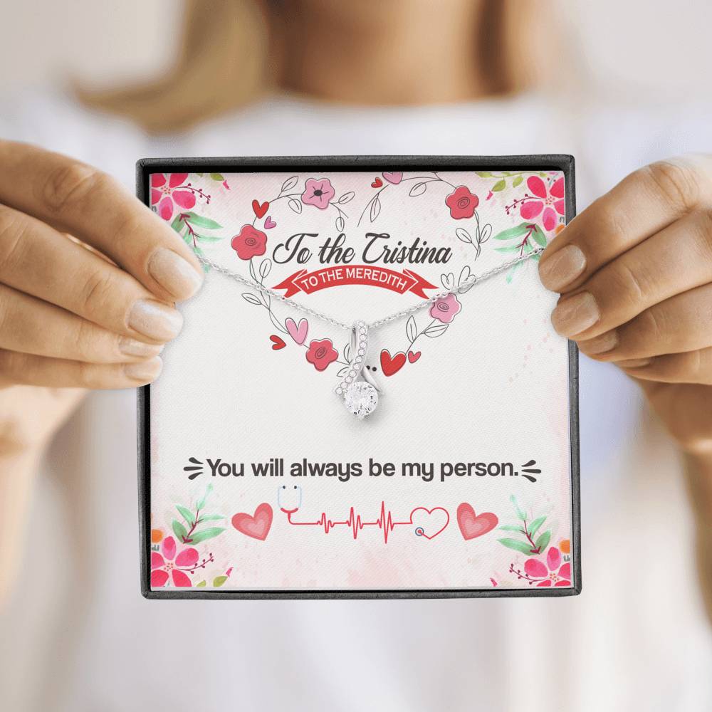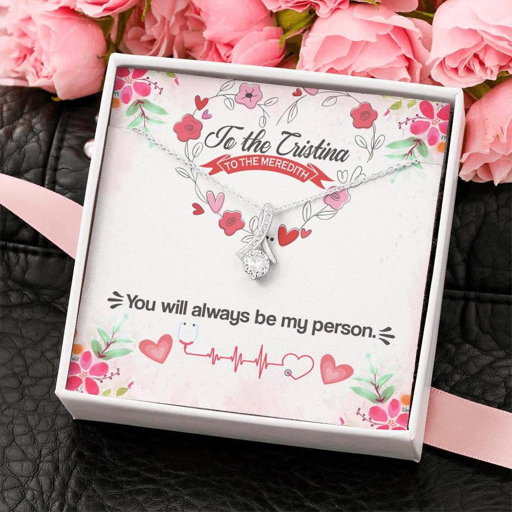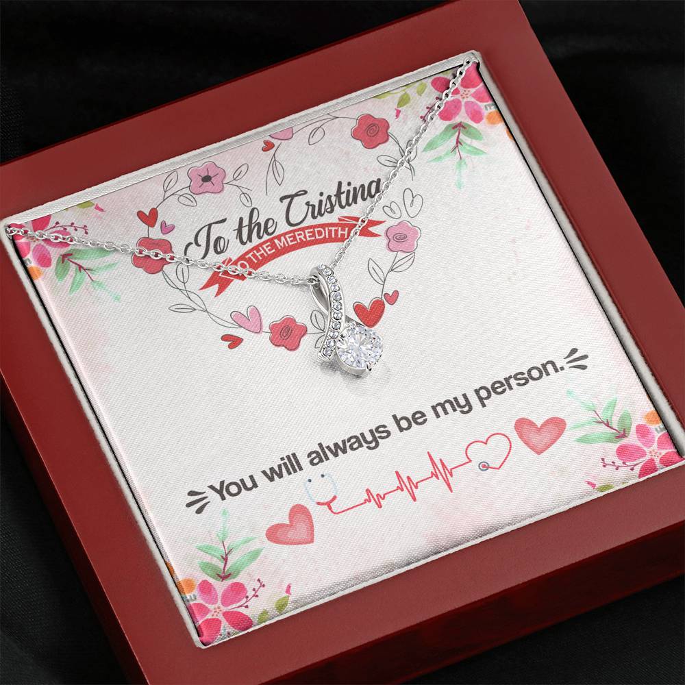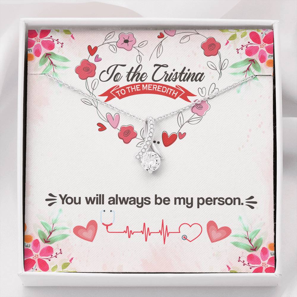 Melt her heart with this ALLURING BEAUTY necklace gift! The petite ribbon shaped pendant is finished with 14K white gold over stainless steel, and is embellished with dainty clear crystals surrounded by a sparkling 7mm round cut Cubic Zirconia.
