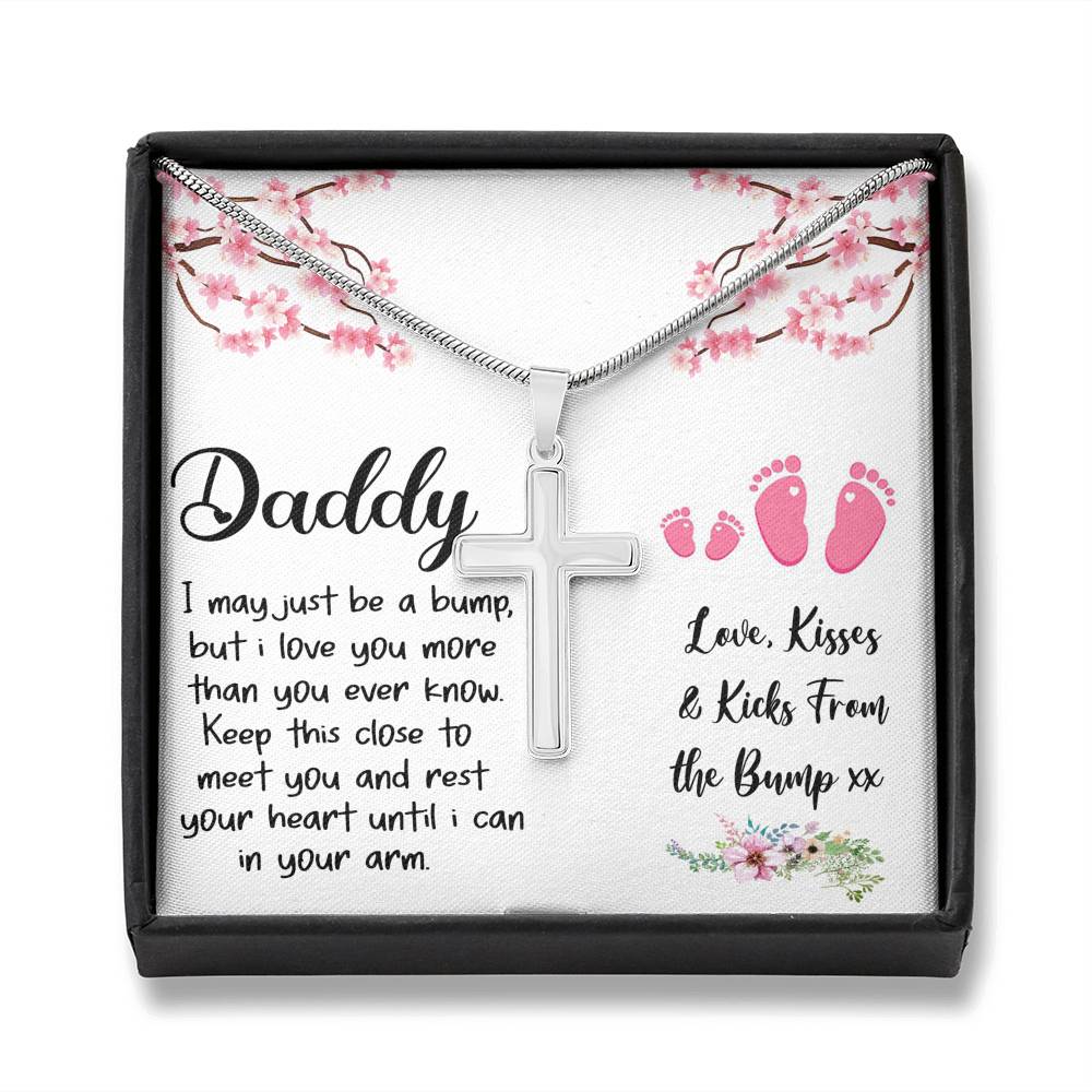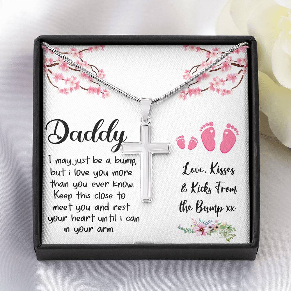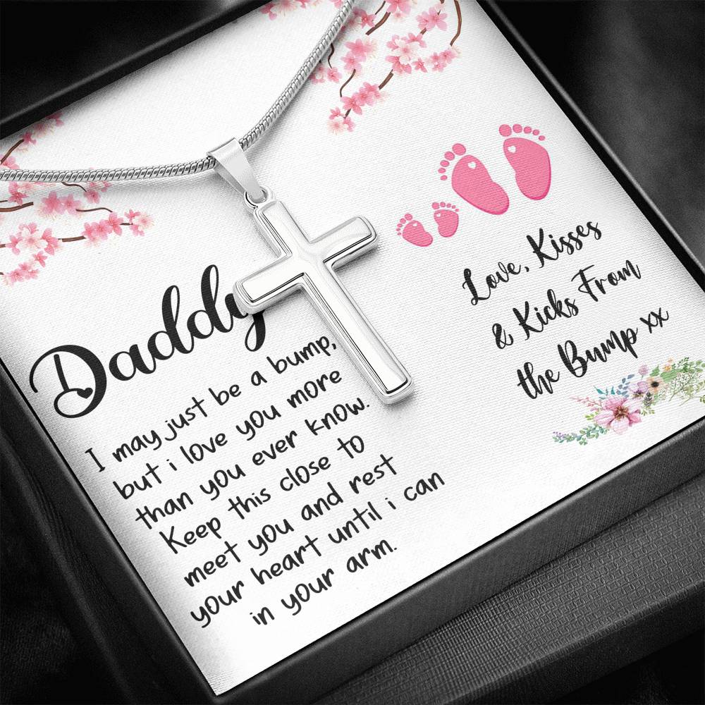 "I may just be a bump, but I love you more than you ever know. Keep this close to meet you and rest your heart until I can in your arm. Love, kisses, and kicks from the bump"