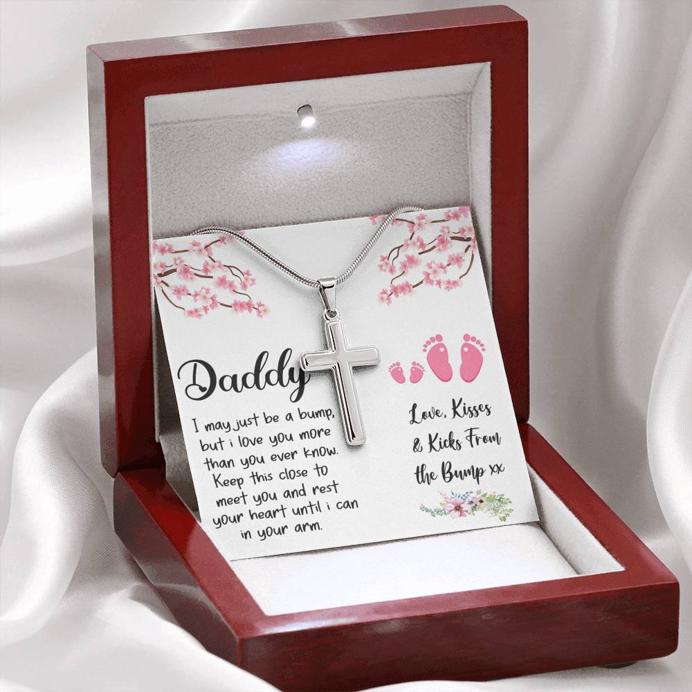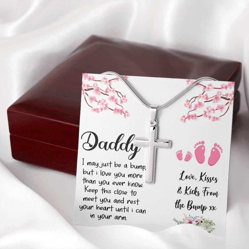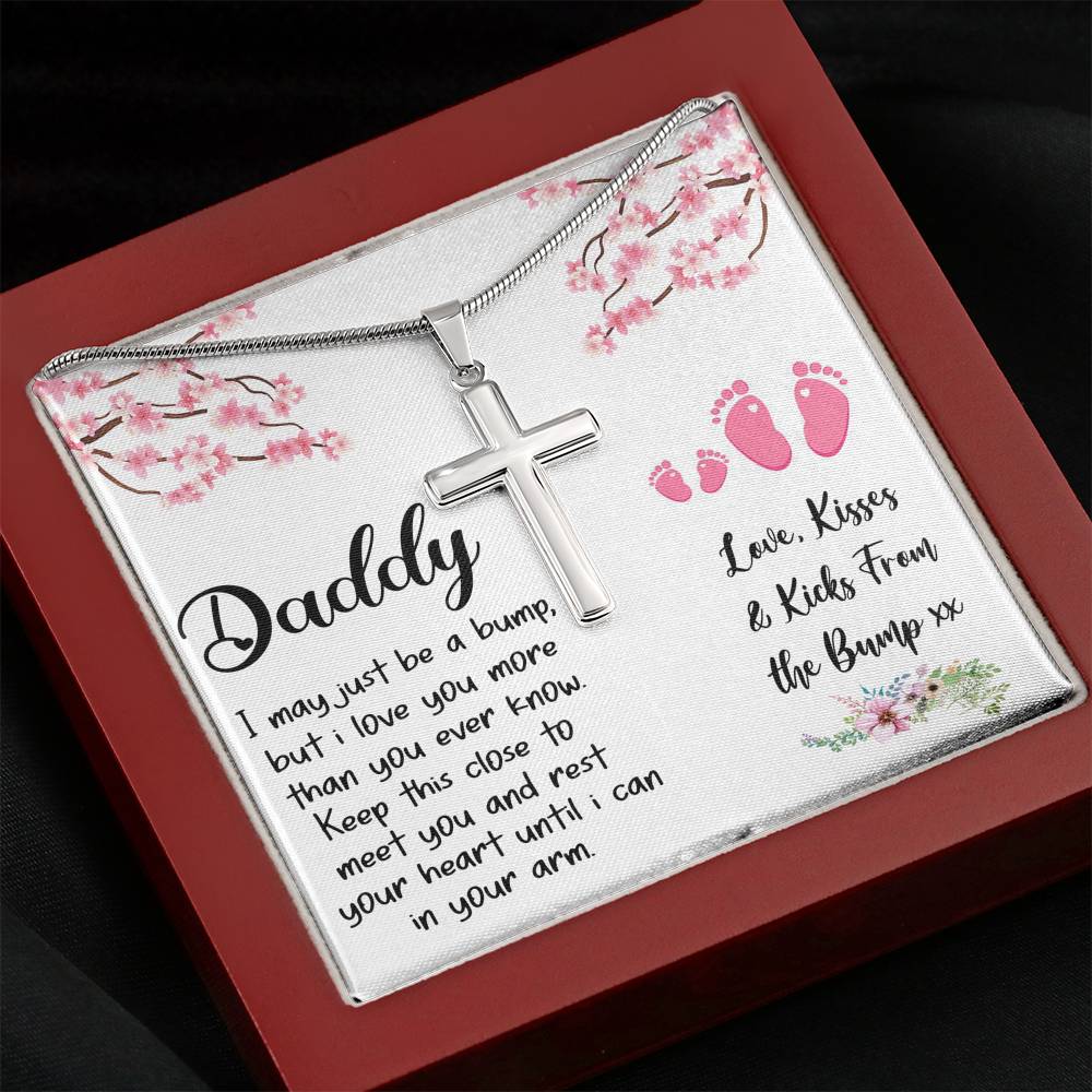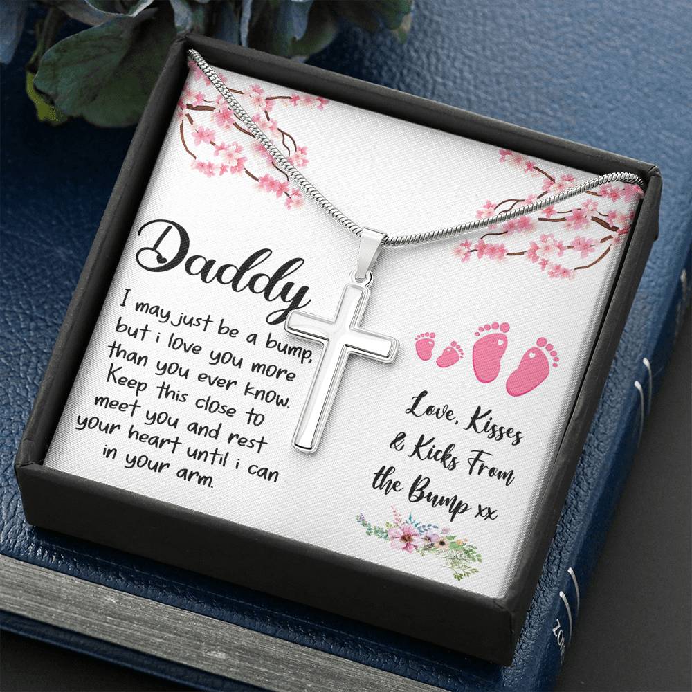 "I may just be a bump, but I love you more than you ever know. Keep this close to meet you and rest your heart until I can in your arm. Love, kisses, and kicks from the bump"