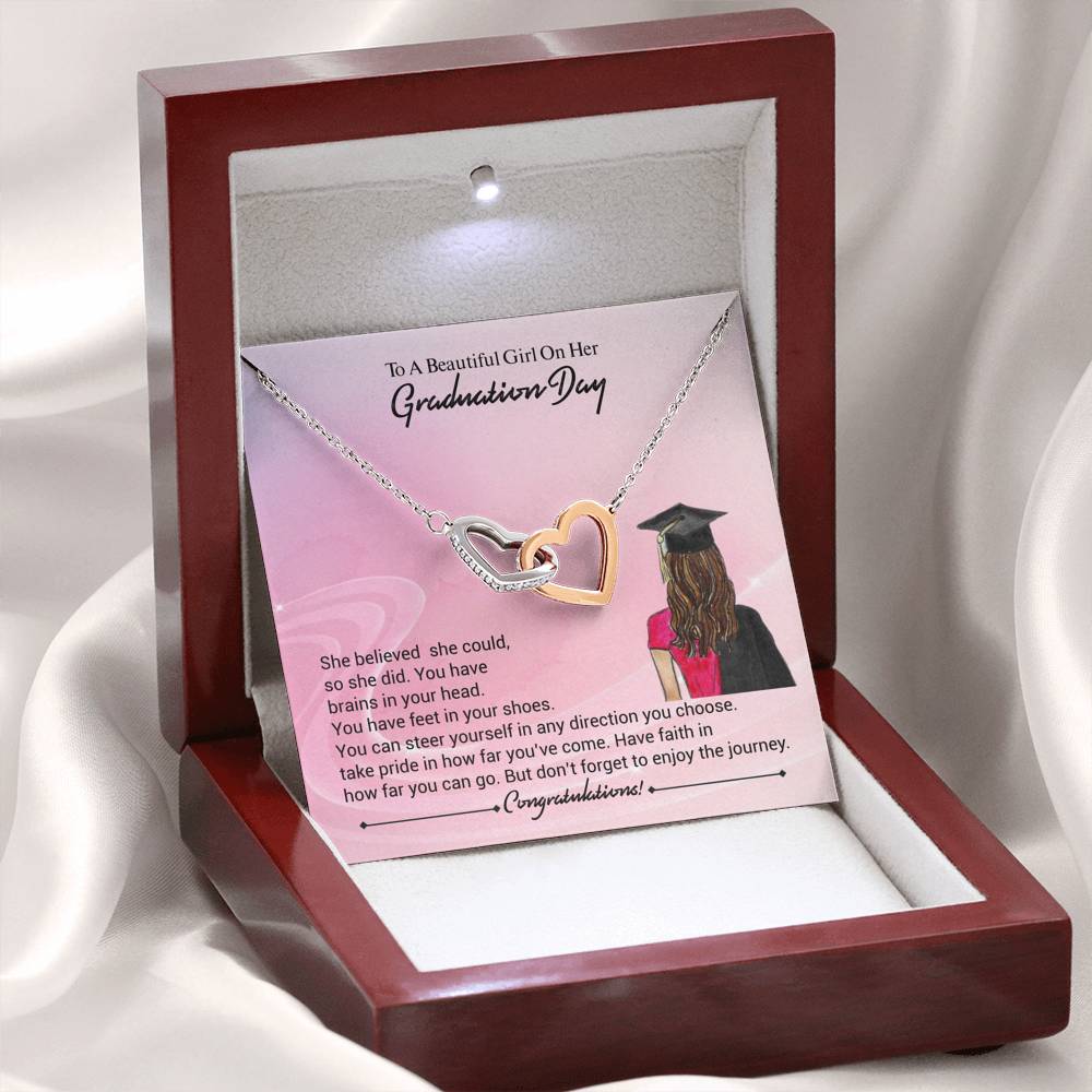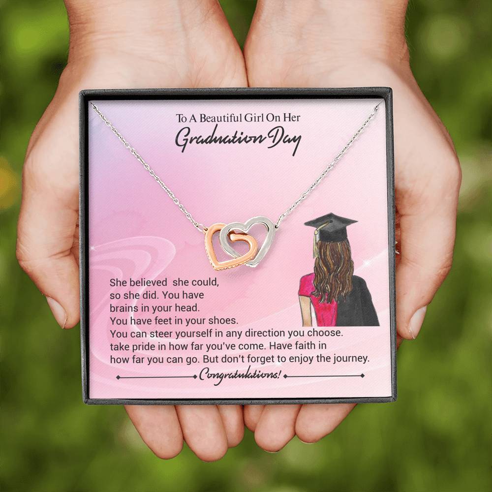 Two hearts embellished with Cubic Zirconia stones, interlocked together as a symbol of never-ending love. Made with high quality polished surgical steel. Cable chain measures 18 inches with a 4 inch extension, and fastens with a lobster clasp.